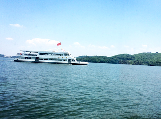 前往島上的途中我們盡享湖中美景,湖面在萬里晴空的映照下,一望無垠,波光粼粼,湖的周圍是綠蔭連綿的山,山水環繞真是美不勝收!